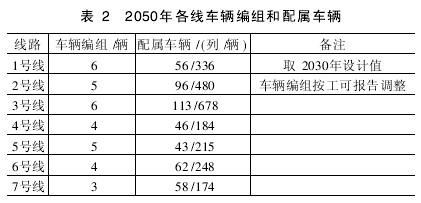 2.1.1 2050年各线车辆编组和配属车辆(表2)。