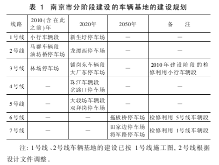南京市现规划的轨道交通有7条线,正在建设的南京地铁1号线规划长度30.6km。一期工程线路全长16.9km,计划2005年通车试运行。南京地铁2号线一期工程全长21.63km。计划2009年建成通车。分阶段建设的车辆基地的建设规划见表1。