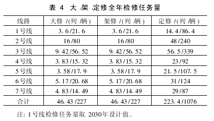 (1)根据各线车辆编组和配属车辆和车辆检修周期可计算出线网大、架、定修全年检修任务量,见表4。