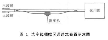 洗车线与出入段线并列布置在运用库咽喉区前,列车入段时需要清洗的列车直接进入洗车线,洗车后通过咽喉区进入停车线(也包括列检、双周检、季检线,下同),洗车工艺为通过式洗车,列车洗车作业只需要1次通过洗车机,且全过程不需要转换列车运行方向。