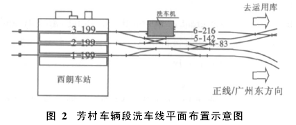 咽喉区通过式布置虽然要求车辆段用地有足够的长度,但由于具有作业时间短、洗车效率高的优越性,因此采用这种布置型式的实例还是很多的,如北京地铁四惠车辆段、上海地铁梅龙车辆段和广州地铁1号线芳村车辆段等。图2是芳村车辆段的洗车线平面布置图。