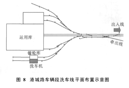 由于这种布置方案洗车效率低,一般只适用于小规模的车辆段(或停车场),或在用地条件确实无法实施其他方案时采用。国内上海地铁车辆段使用这种布置型式比较多,如宝钢车辆段,港城路车辆段等。图8为上海地铁六号线港城路车辆段的洗车线平面布置图。