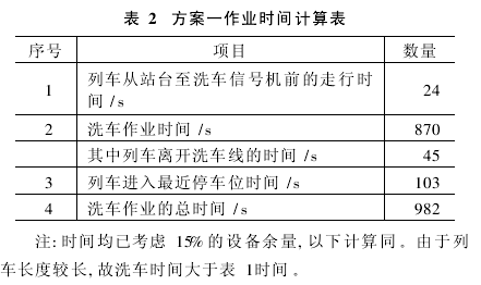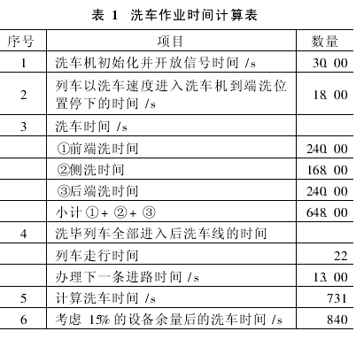 根据哈尔滨威克公司的技术资料,参考广州地铁1、2号线洗车机的实际作业时间进行计算,侧洗洗车速度按3km/h考虑,其结果如表1所示。