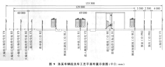 在不考虑列车进出洗车线走行时间的条件下,洗车作业时间基本不受洗车线的布置方案的影响,取决于洗车工艺和设备的效率。以下就国内使用最广泛的哈尔滨威克公司生产的自动化机械洗车机进行纯洗车作业时间的计算分析。以广州地铁3号线的洗车工艺布置,以及6辆编组B型车作为计算模型。图9为广州地铁3号线洛溪车辆段洗车工艺平面布置图。3号线初期为3辆编组,近期为3/6辆编组,远期为6辆编组。所以洗车工艺设计时,考虑了小编组和大编组两种洗车工况。