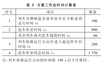 本方案洗车线长度较长,所以列车进出洗车线的时间大于方案一,同时列车洗毕入库前需要改变运行方向,增加了入库时间,总作业时间达到1370s(22.8min)。本方案在洗车线上不设置信号闭塞的条件下,洗车作业的最小时间间隔为1090s(18.2min)。