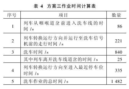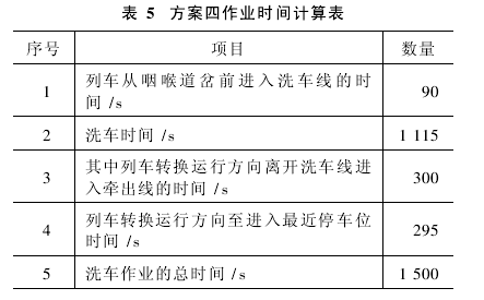本方案列车洗车作业全过程时间为1500s(25min);洗车作业的最小时间间隔为列车从咽喉道岔前进入洗车线至洗毕列车进入牵出线的时间,为1205s(20.1min)。如果列车采用前面3个方案的列车,时间还要有较大增加。