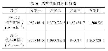 2.3.1 各方案的全过程洗车时间及最小洗车间隔比较表(见表6)