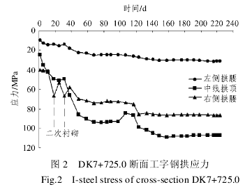 DK7+725.0 断面工字钢拱应力如图 2 所示。从图中可看出,工字钢拱应力在埋设后经历两次较明显的变化,第一次变化是该地下工程开挖 60 d 后形成拱部封闭初支撑时,在继续开挖上部核心土的过程中,该断面工字钢拱应力呈缓慢上升态势,但在施作二次衬砌后,工字钢拱应力基本趋于稳定,最大应力值不超过 70 MPa;第二次变化是在该地下工程开挖 70 d 后,随着下部核心岩土的开挖,该断面工字钢拱应力出现一定幅度的上升,其中,中线拱顶工字钢应力增加较为明显,最大达 110.3 MPa,这是由于下部核心岩土开挖后,使得下部岩土体的支撑压力全部作用在工字钢拱上,但在下部边墙二次衬砌后,该断面工字钢拱应力出现一定程度的下降并趋于稳定。左侧拱腰、中线拱顶及右侧拱腰工字钢拱应力最终观测值分别为 31.2,107.2 和 86.5MPa。