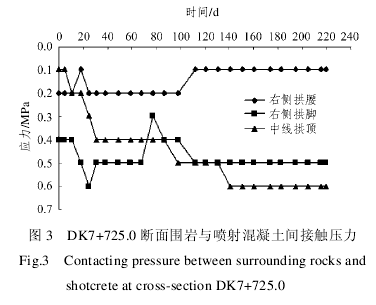 DK7+725.0 断面喷射混凝土与围岩间接触压力如图 3 所示。从图中可看出,该断面围岩与喷射混凝土间接触压力比较小,接触压力在监测的前 4 个月内出现一定的波动,5 个月后基本稳定。右侧拱腰、右侧拱脚及中线拱顶喷射混凝土与围岩间接触压力最终观测值分别为 0.1,0.5 及 0.6 MPa,其中,拱脚和拱顶应力分别是拱腰应力的 5 和 6 倍,这也与实际工程中,通常在拱脚和拱顶易发生跨落[7~9]的事实相一致。监测结果还表明,喷射混凝土与围岩间接触压力波动幅度不大,受施工工序影响较小,但完全稳定需要经历 4~5 个月的时间。因此,该地下工程围岩完全稳定的时间在 4 个月以上。