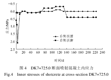 DK7+725.0 断面喷射混凝土内应力如图 4 所示。从图中可看出,右侧拱脚及右侧拱腰处喷射混凝土内应力都不大,且两处应力均有由压应力向拉应力转化的趋势。右侧拱腰喷射混凝土内应力变化比较平稳,基本呈水平状态,说明该点的应力比较稳定,其最终观测应力为 0.0 MPa;右侧拱脚出现小幅度波动后趋于稳定,应力收敛于 0.4 MPa。