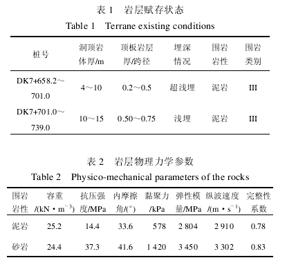 重庆轻轨较新线大坪车站隧道里程为 DK7+609.7~DK7+804.0,全长 194.3 m。该隧道结构复杂,断面变化大,道岔区最大开挖跨度 27.2 m,是目前亚洲城市交通单跨最大的隧道。其中,DK7+658.2~DK7+804.0 为暗挖施工,暗挖段长度145.8 m,最大开挖宽度 26.3 m,开挖高度 20.6 m,最大开挖面积 430.0 m2;车站围岩以泥岩和砂岩为主,强度较低,自稳能力差。隧道顶板岩土体赋存情况及岩层物理力学参数如表 1,2 所示。