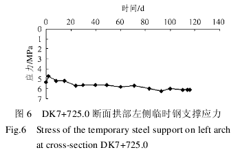临时钢支撑是保证隧道施工安全的重要手段之一。测试临时钢支撑应力可判断临时钢支撑所起作用的大小,同时也能间接反映隧道初支结构的受力变化情况。DK7+725.0 断面拱部左侧壁导坑临时钢支撑应力传感器观测历时 4 个多月。拱部左侧临时钢支撑应力如图 6 所示。从图中可看出,该断面临时钢支撑应力变化较小,最大应力值为 6.1 MPa 左右,处于安全状态。