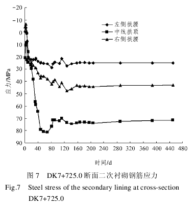 在 DK7+725.0 断面布设 3 个测点,对左侧拱腰、中线拱顶及右侧拱腰处二次衬砌钢筋应力进行应力监测。DK7+725.0 断面二次衬砌钢筋应力如图 7 所示。从图中可看出,该断面各测点二次衬砌钢筋应力在出现不同程度的上升后趋于稳定,其中,二次衬砌中线拱顶钢筋应力最大。左侧拱腰、中线拱顶及右侧拱腰处二次衬砌钢筋应力最终观测值分别为25.0,71.6 及 43.0 MPa。右侧拱腰应力是左侧拱腰应力的 1.7 倍左右,这是由于右侧拱腰上方受到地表建筑物偏压所致。