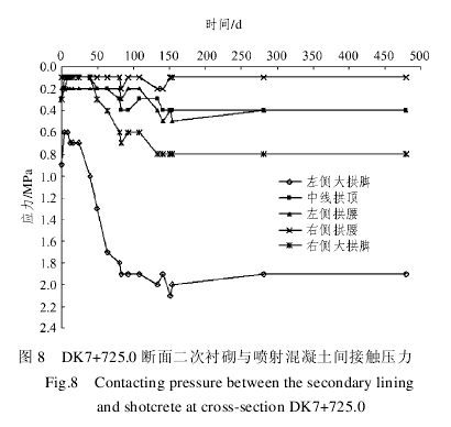在 DK7+725.0 断面布设 5 个测点,对该断面二次衬砌与喷射混凝土间接触压力进行监测;测点位置依次为:左侧大拱脚、左侧拱腰、中线拱顶、右侧拱腰及右侧大拱脚。DK7+725.0 断面二次衬砌与喷射混凝土间接触压力如图 8 所示。从图 8 中可看出,该断面二次衬砌与喷射混凝土间接触压力比较小,接触压力在左侧大拱脚处最大,且只有 2.1 MPa,这说明上部荷载主要由锚喷支护来承担,且围岩发挥自承能力,这与新奥法的思想是一致的。左侧大拱脚、左侧拱腰、中线拱顶、右侧拱腰及右侧大拱脚最终应力观测值分别为 1.9,0.4,0.4,0.1 和 0.8MPa;结构处于稳定状态。