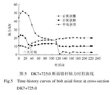 DK7+725.0 断面锚杆轴力传感器观测历时约 7个月,锚杆轴力最终观测值右侧拱腰为 2.9 kN、右侧拱脚为 10.4 kN、中线拱顶为 20.4 kN。锚杆轴力如图 5 所示。从图 5 可看出,右侧拱腰处锚杆轴力的初期值较大,最大达到 51.8 kN,之后缓慢下降,4 个月后下降至 20.0 kN 左右;在该断面下部边墙进行二次衬砌后,锚杆轴力基本趋于稳定。测试结果还表明,锚杆轴力主要在隧道拱部二次衬砌后出现比较明显的变化;另外,隧道下部边墙开挖期间也出现一定幅度的波动,其他时间段基本处于稳定状态;锚杆轴力绝对值较小,处于安全状态。