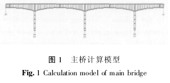 结合该桥施工监控的需要,采用通用有限元软件计算。混凝土的收缩、徐变、温度变化等因素的影响,将使桥梁结构的变形、应力状态及其变化规律十分复杂。各施工节段离散为梁单元,3个主墩视为固定支座,两边跨端视为活动铰支座。其中,总节点数为138个,最大钢束号为112,梁单元个数为133个,施工阶段总数为59。主桥合拢前后结构体系将发生转变,即由对称的单“T”静定结构转变为对称的超静定结构。其计算模型如图1所示。