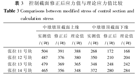 由于钢弦式应变计所测为应变,其中有以上所述诸多因素的影响。本桥施工监控部分实测应变与理论应变值列于表3。以中墩墩顶截面为例,如张拉13号块上缘实测应变为479,理论值为365, 误差高达31%,实测应变偏大主要是收缩徐变、温度变化等因素引起,这部分应变不是由外荷载引起的(本桥施工是采用悬臂浇筑),故需采用修正方法剔除这部分虚假应变。