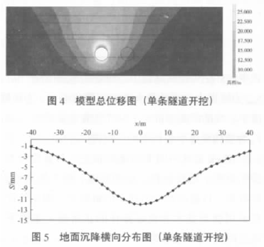 数值模拟计算结果见图 4, 图 5。图 4 表明单条隧道开挖后, 造成了地表下陷, 土层沉降对称分布, 最大沉降出现在施工隧道中心轴线处, 隧道上方的地层沉降随深度增加而增加, 在接近隧道衬砌顶端位置达到最大, 在隧道下方土体出现向上的位移, 在隧道衬砌底端达到最大。由图 5可知地表最大沉降为 12.00 mm。