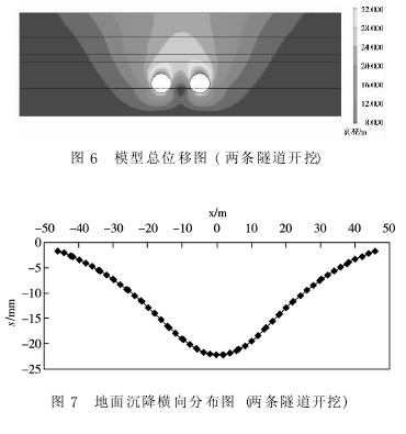 数值模拟计算结果见图 6, 图 7。计算结果显示, 隧道轴线正上方地表沉降最大, 向左右沉降分别逐渐减小, 由于新老隧道开挖的相互影响,地表最大沉降为 22.22 mm, 比经验公式计算结果大 3.96 mm。