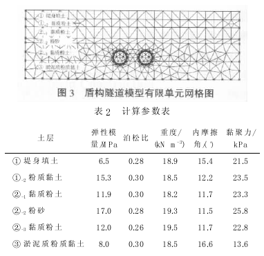 该模型考虑的隧道直径为 6.2 m, 隧道中心埋设高程为-11.92 m, 盾构隧道顶部覆土厚度为 18.7m,两隧道间距 6.0 m, 影响区域土体 100 m×40 m。地基土层包括 6 个不同土层, 由上而下分别是堤身填土, 厚 4.0 m; 黏质粉土, 厚3.5 m; 黏质粉土, 厚 5.4 m; 粉砂, 厚 2.1 m; 黏质粉土, 厚 8.3 m;淤泥质粉质黏土, 厚 8.5m; 更深部分则被看作完全坚硬, 以合适的边界条件加以模拟。土孔隙水压力分布是静态水压, 水位高程 ( 参考地质勘察报告) 取为 6.5 m。数学模型如图 3 所示。土层采用 MOHR- COULOMB 模型, 隧道衬砌采用线弹性, 厚度为 0.35 m。数模分析中考虑的荷载有结构自重、水土压力, 模型采用 15 节点单元为基本单元类型, 共有 582 个单元, 4 901 个节点。计算参数见表 2。