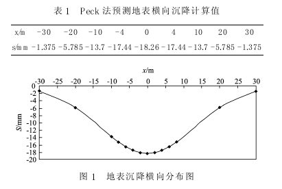 杭州地铁 1 号线过江隧道外径为 6.2 m, 土内摩擦角取为 23.2°, 隧道顶部覆土厚度有 18.8 m,运用 Peck 公式计算可得沉降槽半宽 W/2=33.0 m,计算结果见表 1, 地面沉降横向分布见图 1。