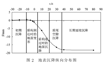 3) 纵向地表沉降。纵向地表沉降分为 5 个阶段, 即初期沉降、盾构到达时的地面变形、盾构通过时的地面变形、盾尾空隙沉降和长期延续沉降, 其中盾尾空隙沉降和长期延续沉降占总沉降的比例为 50%~80%。