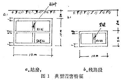 1995年1月17日,发生在日本兵库县南部(阪神地区)的地震,对开挖式施工的地铁工程,造成了严重震害。有的因柱子被压碎,而造成地面塌陷。日本大林组技术研究所关于兵库县南部地震的调查资料介绍了三宫段尚未压坍的结构典型破坏特征(图1)。文中还介绍了一些与震害轻重有关的因素,其中很重要的一点是:地下结构上部土层厚度越厚,震害越轻。如图1中站房的上层中柱,土层厚度仅为3m,而震害却比埋深8m的线路段中柱破坏重得多,柱子中间部份几乎压碎,而线路段柱仅在中间位置出现竖向裂缝。这种特点是很值得分析的。