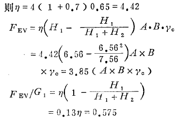 为计算简便,可将土层厚度化为等效的混凝土厚度。取土的重力密度v =18kN/m8,混凝土的vc= 25kN/m8,则等效厚度h=8m x 18/25 = 5.76m。此时,上部土层及顶板的总厚度H1 = 5.76m + 0.8m = 6.56m,底板厚度H2=1.0m。在用公式(1 ),式(3)计算时,便可用H1代G1 , H2代G2。
