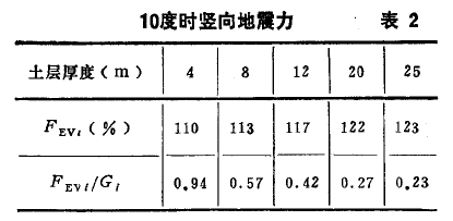 现以线路段为例,设土层厚度分别为4m,8m,12m,20m, 25m,计算竖向地震力与静重力的比值,以及各种情况竖向地震力绝对值的相对关系,以分析土层厚度对震害的影响。计算结果列于表2。从表2中可以看出,土层越薄,竖向地震力与静重力的比值越大,震害也越重。当土层厚度在20m以上,其比值已小于3000,一般不会发生震害。