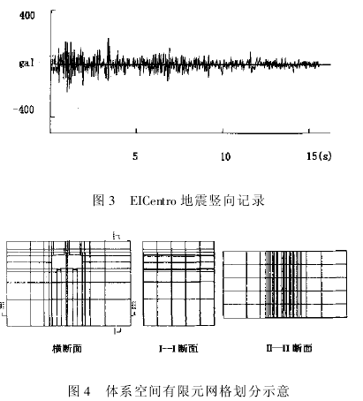 {Iy}=[10,1,0,…,1,0]T,关于竖向加速度值的采用,一般酌情用水平值的0.25~0.5倍,若有地震竖向加速度记录,应用实际记录,EICentro竖向地震记录,如图3所示。有限元计算网格的左右边界采用水平约束,下边界固定,上边界自由,采用Newmark隐式时间积分法求解方程(1),即可得出水平及竖向地震荷载分别作用下任一结点的位移时程、加速度时程;单元内任一高斯点在某时刻的主应力大小。上述平面分析方法对了解地铁区间隧道任一断面的地震反应有很大作用[3,4]。分析地铁入口、隧道转弯等处的地震特性可采用空间有限元进行分析。分析网格如图4,笔者采用的以上分析方法有以下特点: