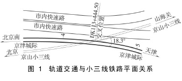 京津城际轨道交通在天津市区跨越京山铁路小三线,由于市区内既有建筑物较多,限制了轨道交通平面线形的选择,致使京津城际轨道交通与京山铁路小三线的立交条件很差,两条线的夹角仅为18·3°,且两条线均位于平面曲线上,其平面关系详见图1。