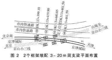 综上所述,结合该工点的具体情况,跨既有京山铁路小三线的桥梁最佳施工方案是预制架设,进而提出了框架墩与简支梁的桥式方案,即2个框架墩配3孔20m简支梁,详见图2。