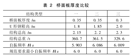 计算分析选择了不同梁高与不同桥面板厚度的情况,进行了自振频率的计算和比较,表2列出了3种组合的计算结果。