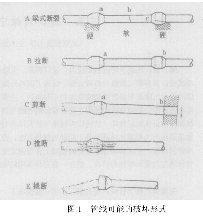管线功能失效的形式是多样的,并因其周围土体受到施工扰动而产生附加应力和附加变形。同时,由于管线的刚度远大于土体的刚度,又必然会对周围土体的移动产生抵抗作用。在施工扰动作用下,管线可能产生泄漏,甚至结构上的破坏Clarke[8]系统总结了管线的各种破坏类型及其原因,如图1所示。Attewell[9]等提出了脆性灰铁管的几种功能失效的模式:①纵向弯矩引起横向断裂;②环向弯矩引起纵向劈裂;③熔断、由长期腐蚀引起孔洞或穿孔;④管线接头处泄漏;⑤引入连接点处泄漏;⑥直接冲击引起损伤。上述破坏形式的出现与管线的材料、接头类型、几何尺寸等多种因素有关。在地铁施工过程中,开挖引起周围地层的差异沉降是导致管线功能丧失的主要原因,主要表现形式为纵向弯矩引起的横向断裂。对于非刚性连接的管线,地层差异沉降导致的管线接头张开也是非常普遍的现象。