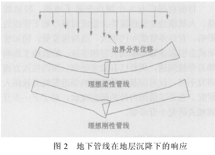 如图2所示,理想刚性管变形类似独立刚性管段,变形由接头转角独立承担;理想柔性管变形与地层一致,其变形直接反映地层移动的曲率,接头处无转角。理想刚性管主要通过接头的相对转动承受变形,理想柔性管承受变形主要是在管内产生弯矩,实际的管线属于刚性管还是柔性管主要取决于管—土的相对刚度、接头弯矩承载力、接头相对于地层移动的位置,等等。