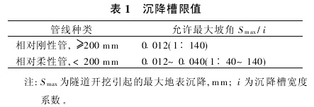 O′Rourke&Trautman[10]提出了一种管线损害评估的经验方法,主要参考指标是管线可能受损处的地层移动坡角Smax/i,它与可能的管线破坏的关系是高斯沉降分布的函数。对砂层中的浅埋隧道,规定了横向沉降槽的Smax/i限值,如表1所示。