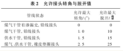 如表2所示,Attewell[9]等人给出了铸铁管在地层移动作用下接头转角与脱开的允许值。