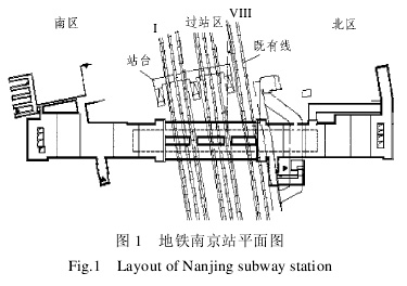南京地铁 1# 线的南京站是国内首次在既有铁路站场下采用矿山法施工的地铁车站,受南京铁路站场制约,地铁南京站被分割为南区、北区和过站区 3 个部分(见图 1),南区、北区为双层明挖箱型框架结构,过站区在既有南京铁路站场下方,下穿铁路南京站三个站台和第 I~VIII 股道线共 8 条股道,其中 II 道和 VIII 道为京沪铁路上下行正线,其余则为站线。过站区结构型式为双线分离隧道,隧道跨度大、埋深浅、线间距小,采用暗挖矿山法构筑。国外也有在既有铁路站场下修建地铁车站的例子,但是并不是采用暗挖法施工[1]。国内只有广州地铁2# 线(火车站—三元里)隧道下穿广州火车站站场的工程[2]与本工程有类似之处,但是广州地铁 2# 线区间隧道下穿广州火车站站场采用的是盾构法穿过,从施工难度和施工风险程度来看均小于本工程。由于南京站为大型铁路枢纽站场,京沪铁路又是国内最重要的 I 级繁忙铁路运输干线之一,每天通过和到发列车达 170 对,因此在过站区施工过程中,必须严格控制线路路基沉降,确保南京铁路站场正常运营和通过列车的行车安全。而掌握过站区施工对线路影响最直接的手段是对线路路基和便梁支墩的沉降变形进行监测,根据监测结果可及时调整施工进度和支护参数。