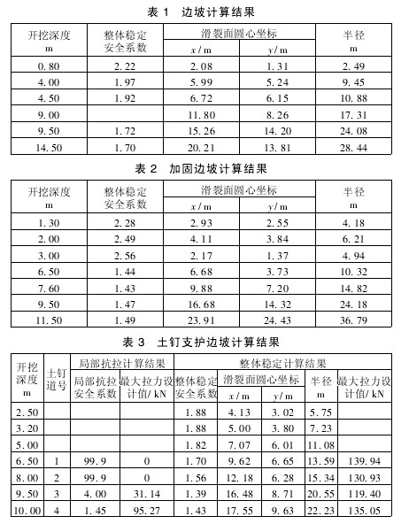 5)采用《理正深基坑支护结构设计软件F-SPW》进行局部抗拉设计、整体稳定设计、土钉设计。基坑计算结果见表1~表3。