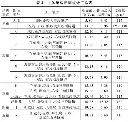 5)为满足隧道功能要求,隧道主体结构断面变化频繁、复杂多样,按形式、尺寸等共分有15种断面。分别对每种断面进行断面设计、配筋设计,针对隧道不同地段,满足隧道限界、功能要求的前提下精心设计,设计最经济的结构断面,控制工程量。