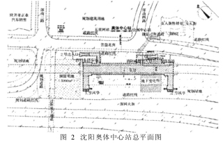 (4)车站布设应与城市道路网及公共交通网络密切结合,应符合轨道交通网络规划和城市总体规划的要求,应与城市总体规划和车站所在地区的城市规划相互协调,如沈阳地铁二号线的奥体中心车站的2号出入口就距公交车站新华社站距离大约为50m,地铁路线的密度和车站的数目均比不上地面公交线路网,必须依托地面公交路线网络,使其能最大限度地吸引客流,为地铁车站往返运输乘客,使地铁成为快速大运量的骨干交通动脉,一般将地铁车站设在道路交叉口,公交路线在地铁车站周围设置车站,方便公交和地铁之间的换乘。