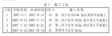 该工程根据结构特点采用了六次制作、四次下沉的施工工艺进行沉箱施工。施工中采用了在沉箱外围设置支撑及压沉系统。根据沉箱不同下沉阶段通过在外围采取支撑形式或压沉形式来控制沉箱下沉速率及下沉姿态。在施工过程中,严格气压控制, 同时针对沉箱下沉不同阶段还采取了泥浆减阻, 灌水压重等手段进行施工过程控制。主要施工工况如表1 所示。