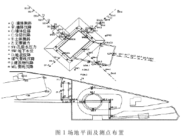在施工期间对沉箱周围土体的水平与垂直、地下水位、孔隙水压力等进行了测量, 并对相邻的煤气管、建筑物进行了沉降监测。施工场地及监测点平面布置如图 1 所示。