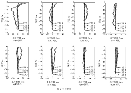 在沉箱周围共布置 8 个土体侧移测孔, 北侧 3 孔(T5、T6和 T7), 西侧 4 孔(T1~T4), 东南侧 1 孔(T8)。8 个测孔在不同工况下的变形曲线如图 2 所示。