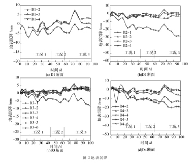不同施工工况下各断面地表沉降如图 3 所示。从 4 个断面的地表沉降曲线可以看出, 各个断面的最大地表沉降点均在最靠近沉箱的测点, 随着距沉箱边距离的增加, 各测点的地表沉降逐渐减小。最大沉降点位于 4 号断面的 D4- 2 测点, 其最大沉降达 - 28 mm。