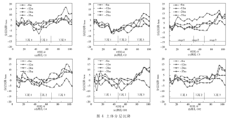 在沉箱两侧共布置 6 个土体分层沉降测孔, 各测孔土体分层沉降如图 4 所示。不同深度处各测孔的沉降规律基本一致, 沉降量同时增加或减小。图 3 和图 4 监测结果均表明沉箱施工周围土体沉降的影响很小。
