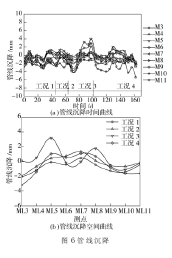 邻近管线各测点在沉箱施工期间的沉降曲线如图 6 所示。就沉降曲线的整体形状而言, 沉箱施工对各管线变形的影响并不大, 且各管线测点的垂直变形并无明显的变化规律。管线各测点中最大沉降点为 M3 测点, 其最大沉降为- 5.4 mm, 发生在工况 4; 各测点中最大上抬位置在 M5 测点,其最大上抬位移为 4.0 mm, 发生在工况 3。