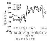 沉箱周围水位测点水位的相对变化如图 7 所示。工况 1和工况 2, 沉箱下沉深度较浅, 沉箱底部施工施加的气压也较小, 气压平衡作用效应不明显, 因此地下水位变化幅度不大, 其中 SW2 测点的最大水位下降幅度仅为 - 37.8 mm; 随着箱体的第三次下沉, 所有测点的水位迅速上升, 且各测点水位的上升幅度相近, 工况 3 下最高水位点为 SW3 测点, 其水位相对于初始水位上升了 91.7 mm; 箱体第四次下沉后期,各测点水位相对于工况 3 有稍许的下降, 但水位仍高于初始水位。