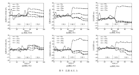 沉箱周围测点孔隙水压力变化如图 8 所示。距地表越近, 孔压的变化量越大。距沉箱最近的两个测点 SY01 测孔最大孔压变化量为 10.67 kPa, 深度 - 6 m; SY02 测孔最大孔压变化量为 24.38 kPa, 深度 - 6 m。整体而言, 从工况 2 开始孔隙水压力的变化值较大, 与地下水位的变化原因一致。