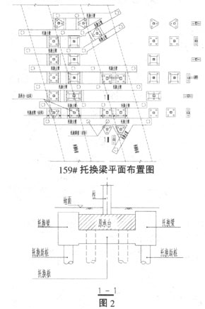 经过多轮的专家评审,根据建筑物与隧道关系,桩梁结构布置,及经济比较,专家推荐采用桩梁托换。承台下方由板传力,板根据荷载与跨度相应配筋,四边由主梁和次梁支承。原来设计布置时次梁底与板底平齐,梁顶与承台第二道台阶面平齐,来增加托换结构的整体稳定性。不采用植筋连接。